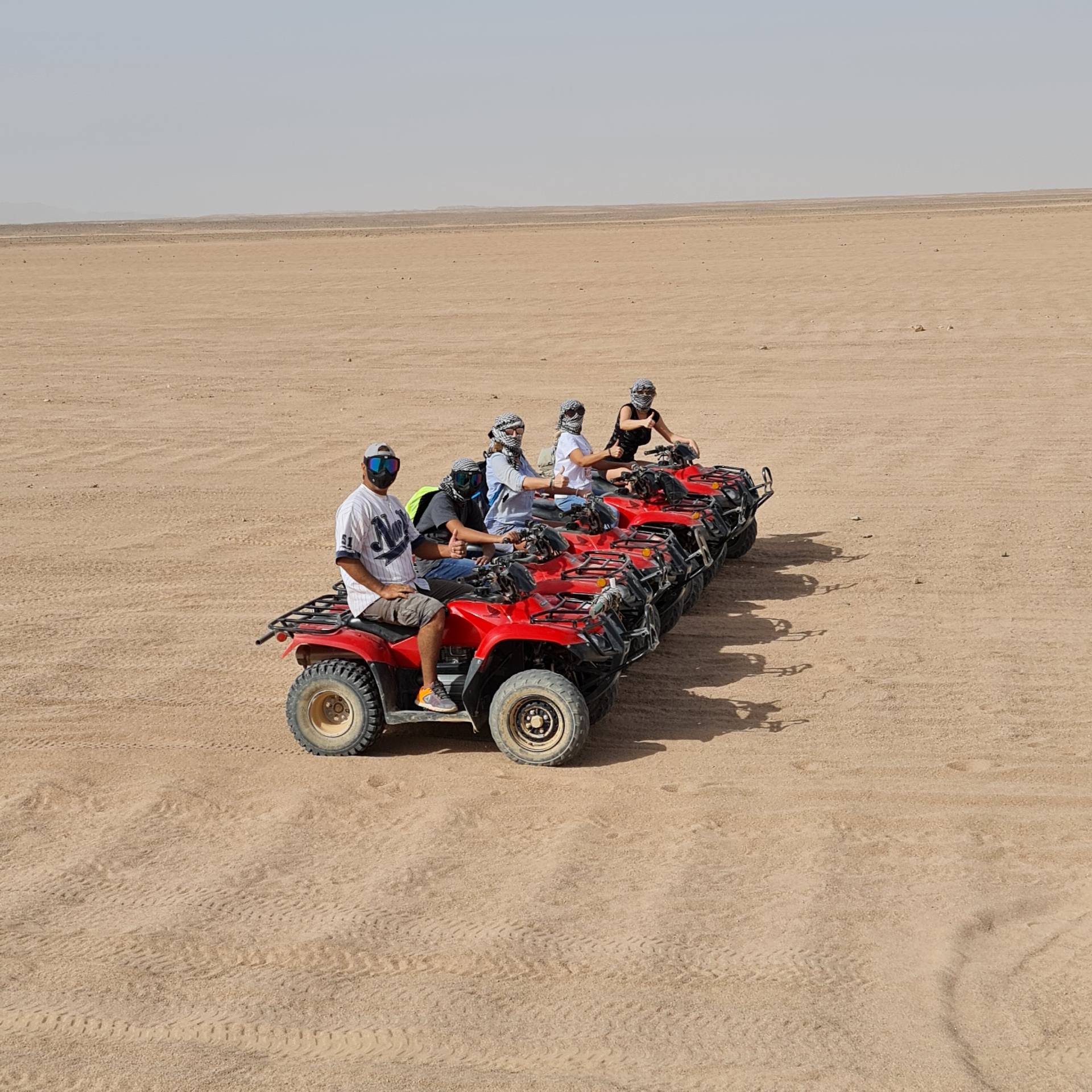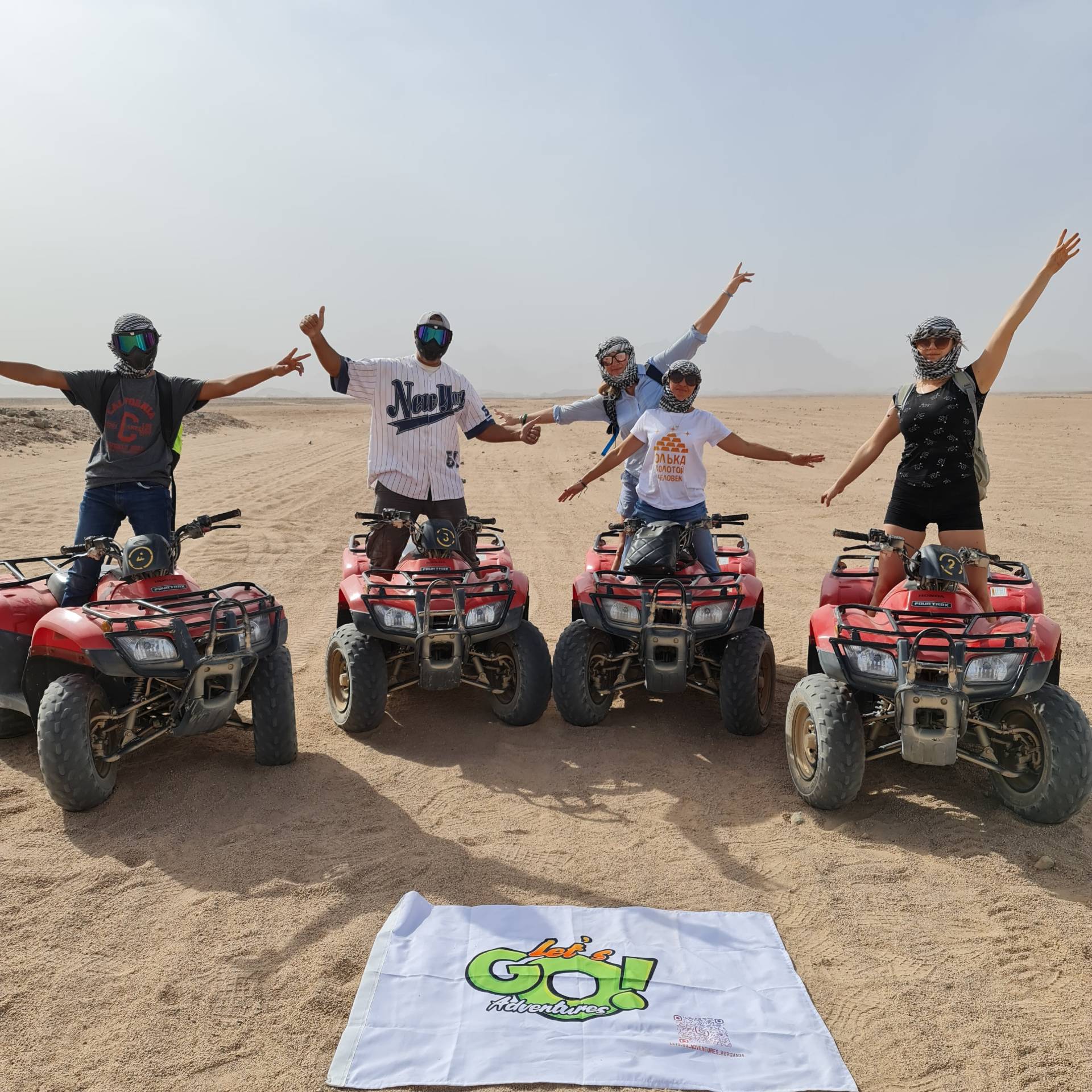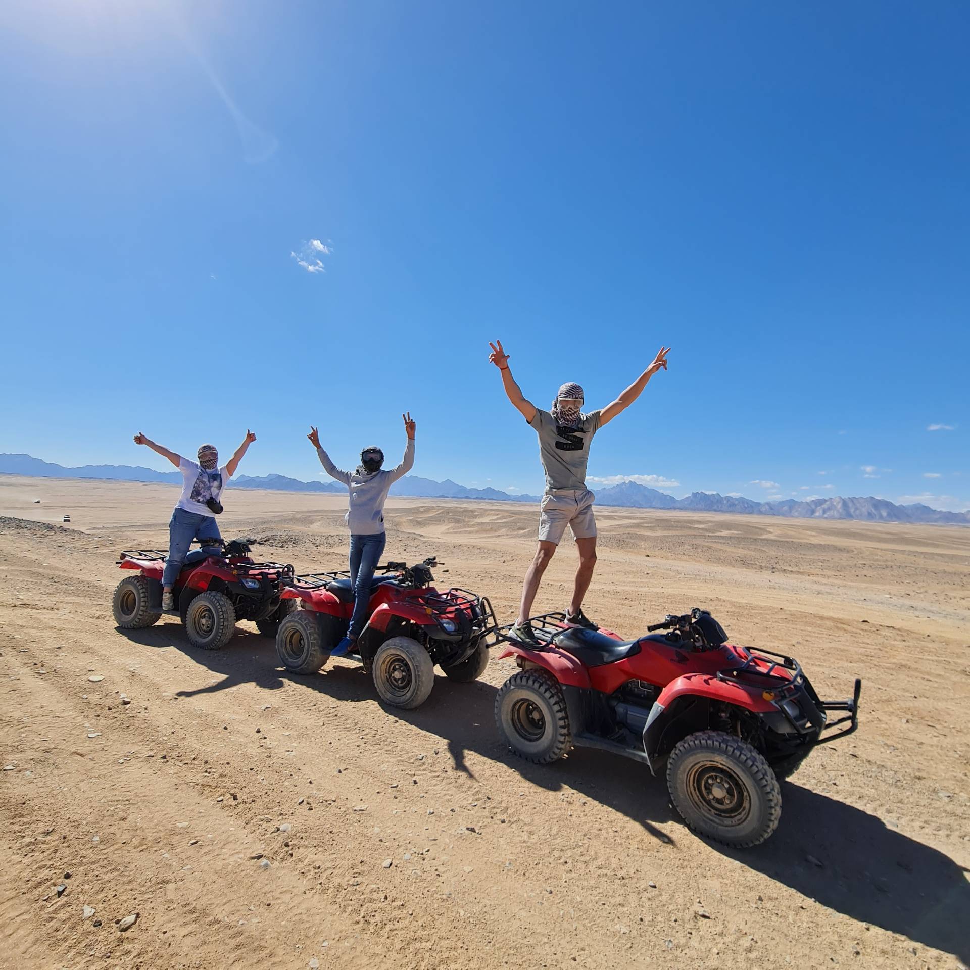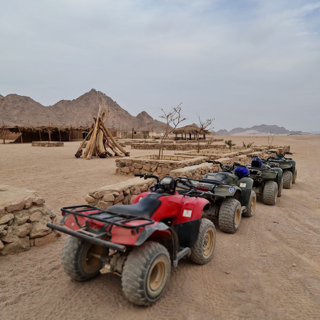 🔸45 минут - квадроциклы 🔸песчаная гора 🔸посещение бедуинской деревни и катание на верблюдах 🔸переезд в деревню Ом Дальфа на джипах 🔸мини-поход по горам (живые источники, каньон, дикая природа) 🔸бедуинский чай с лепешками 🔸встреча заката 🔸ужин с бедуинами 🔸возвращение в Хургаду