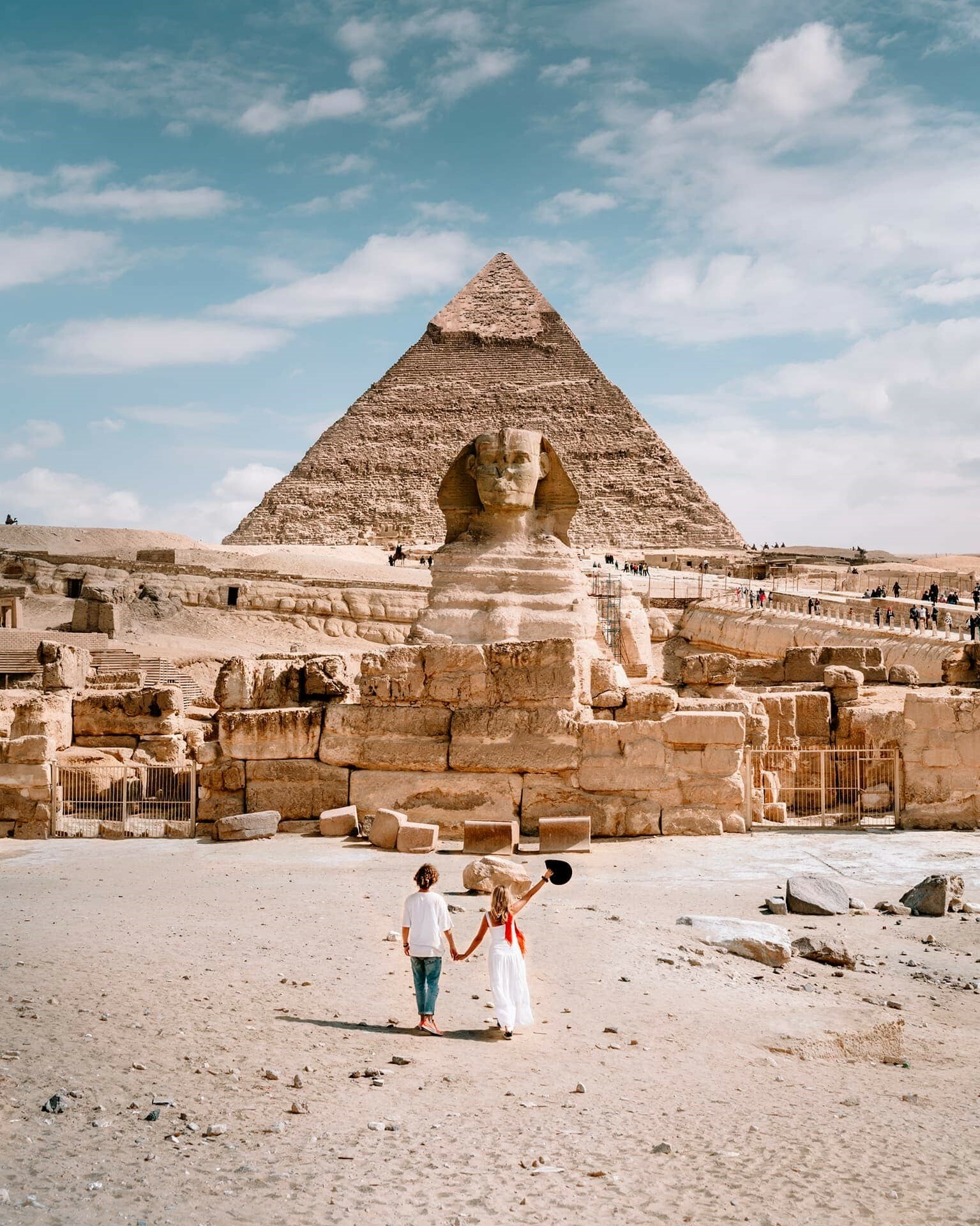 Далее Вы отправитесь на пирамиды в Гизе, где находится самая большая пирамида в Египте (Хеопса) и входит в число Семи чудес света. Ее высота составляет 140 метров, а возраст оценивается примерно в 4500 лет. Вы прогуляетесь около Пирамиды Хафры и Пирамиды Менкаура, а также менее крупных пирамид-спутников, известные как пирамиды цариц и пирамиды долины. Вас будет ждать статуя большого Сфинкса: Сфинкс, был вытесан из единой глыбы такого же материала, что и пирамиды Хеопса и Хефрена и представляет собой лежащего льва с головой человека.